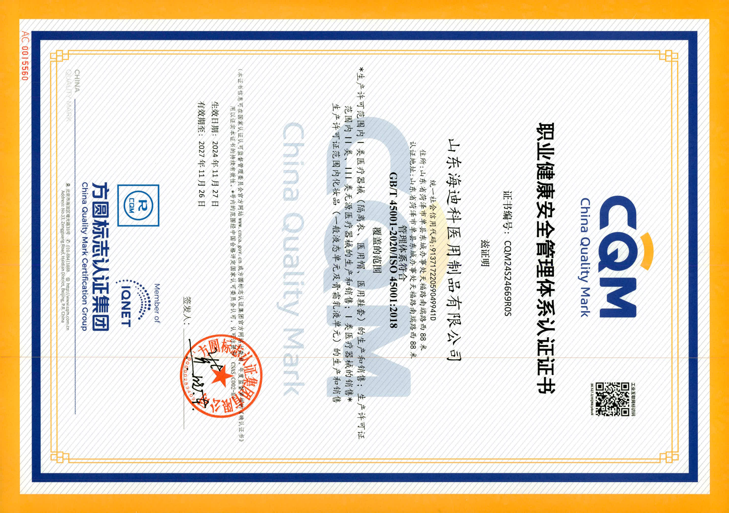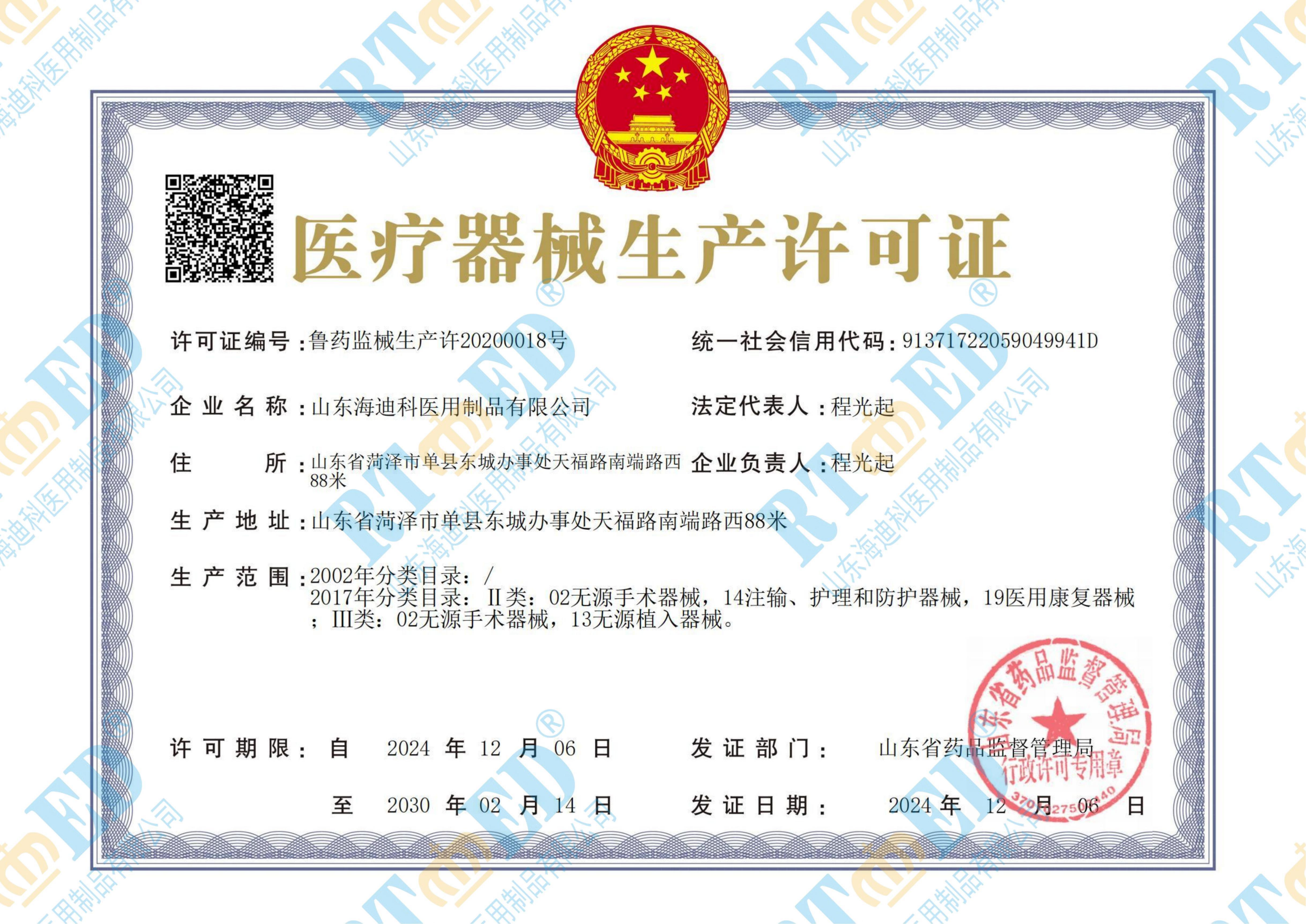 • 海迪科醫療器械生產許可證